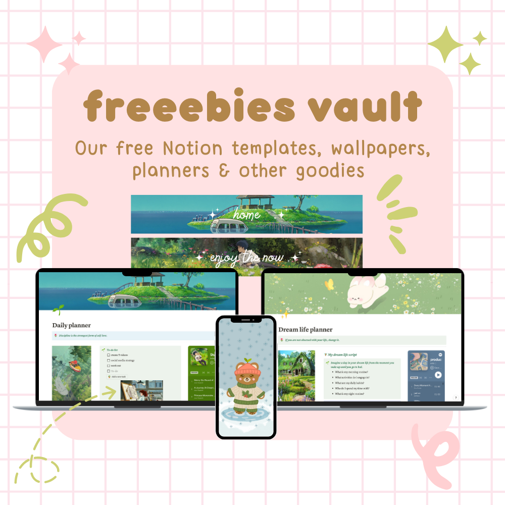 Get access to our freebies vault that contains our free Notion templates, cute wallpapers and other fun goodies 🤭👀📝