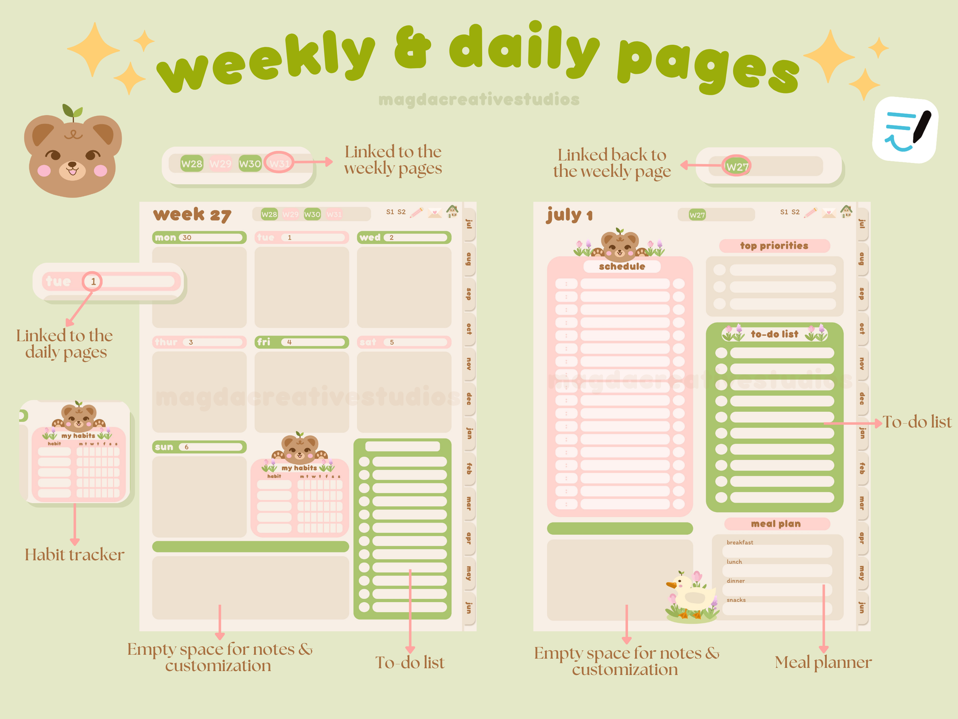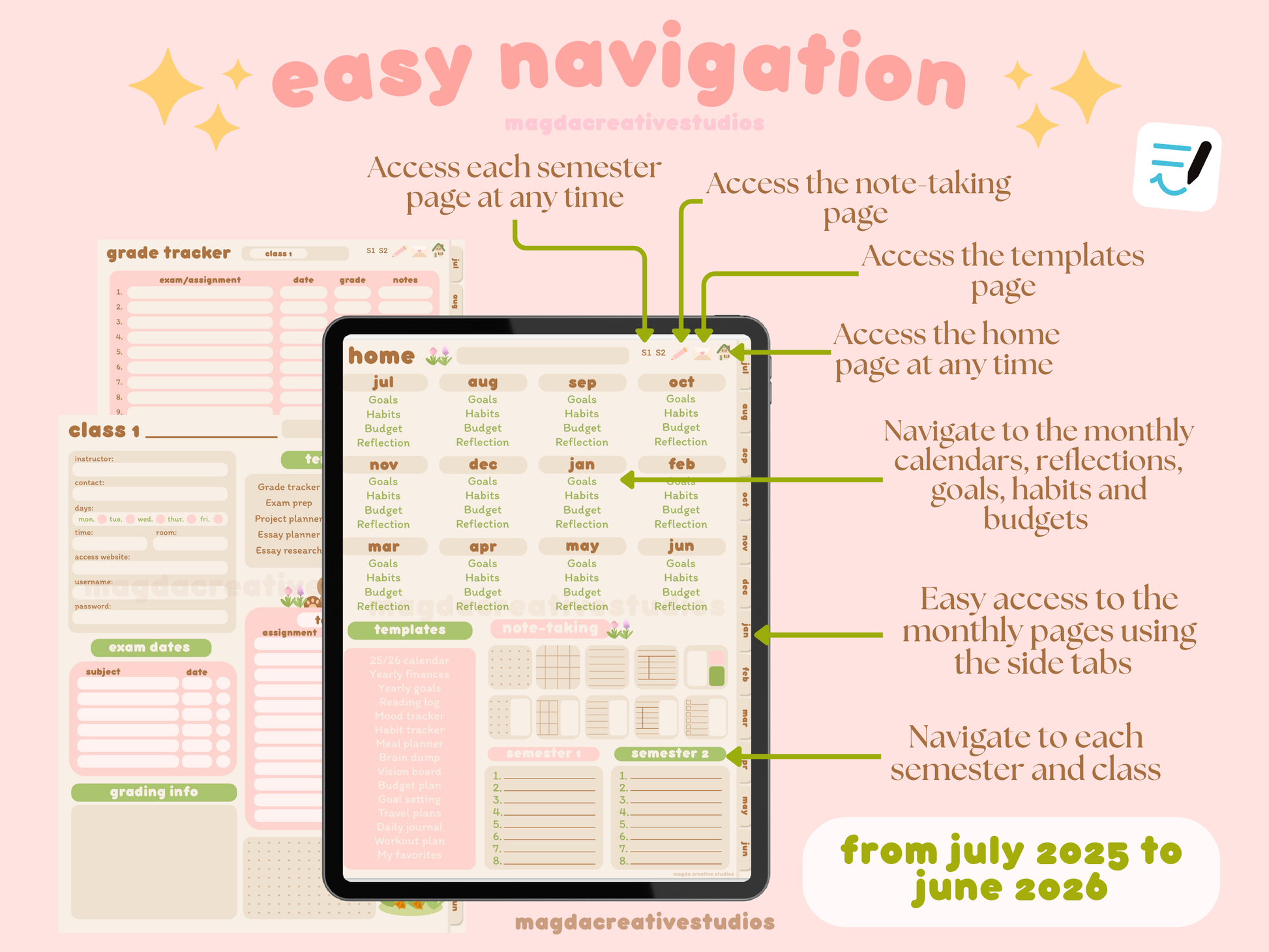 The planner is from July 2025 till June 2026, it's fully hyperlinked and dated so you won't need to duplicate pages.😊 You can quickly and easily navigate through the planner's various sections using the side tabs and the navigation menu in the top right corner. It contains more than 2000 hyperlinks that make it super easy to navigate all its 684 pages. 🧚✨