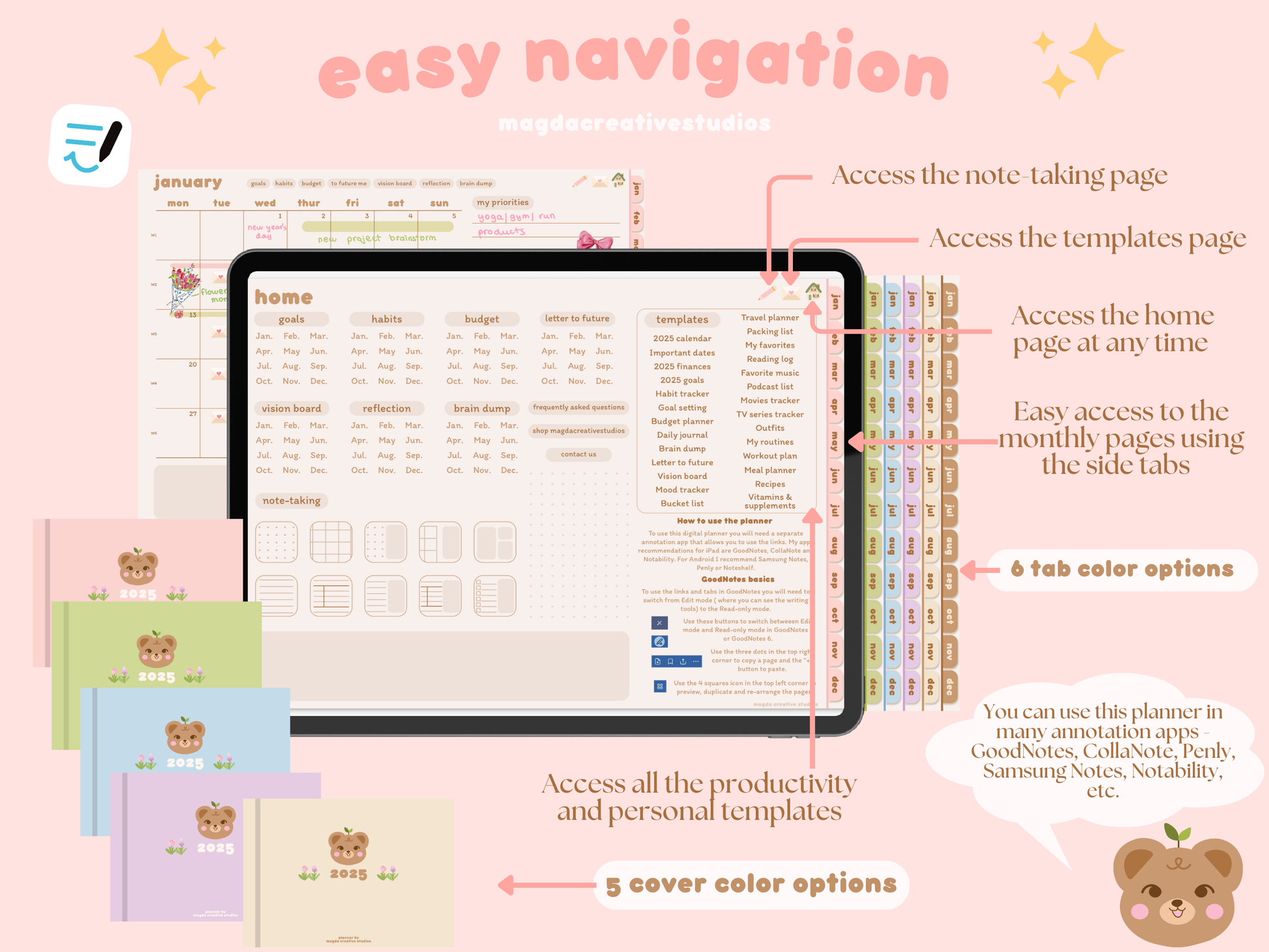 You can quickly and easily navigate through the planner's various sections using the side tabs and the navigation menu in the top right corner. 🥰 It contains more than 2000 hyperlinks that make it super easy to navigate all its 615 pages. 🧚♀️✨