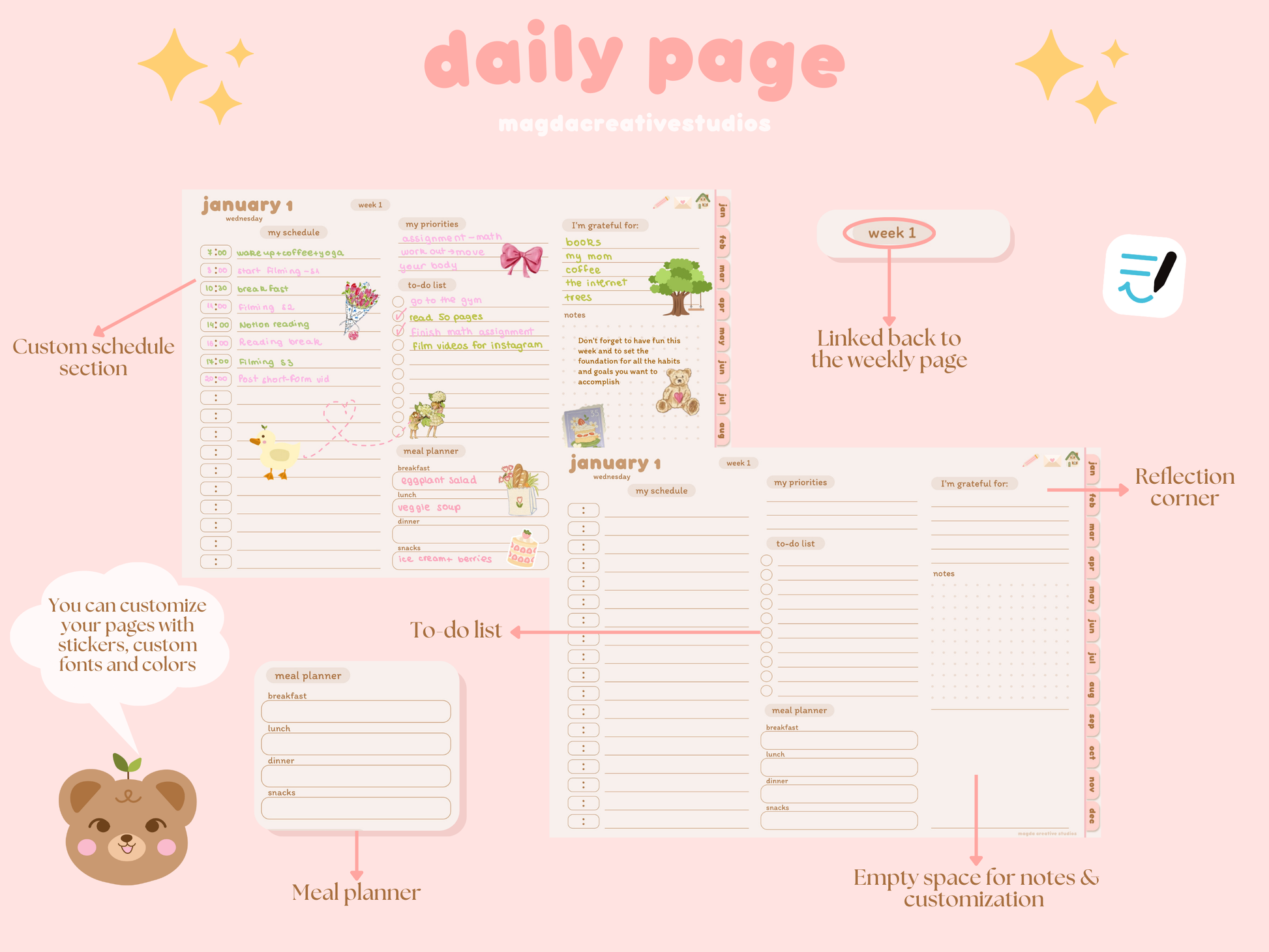 📱 Our daily planner comes in PDF format, making it ideal for GoodNotes or any other PDF annotation app ( Notability, NoteShelf, CollaNote, Samsung Notes, Penly, etc.) on various devices - iPad/tablet, phone, laptop or desktop.