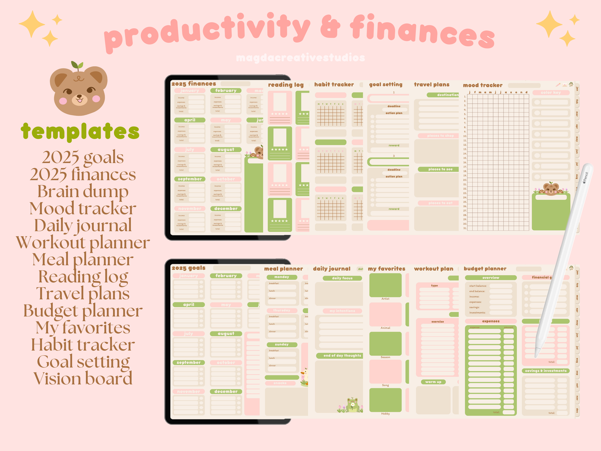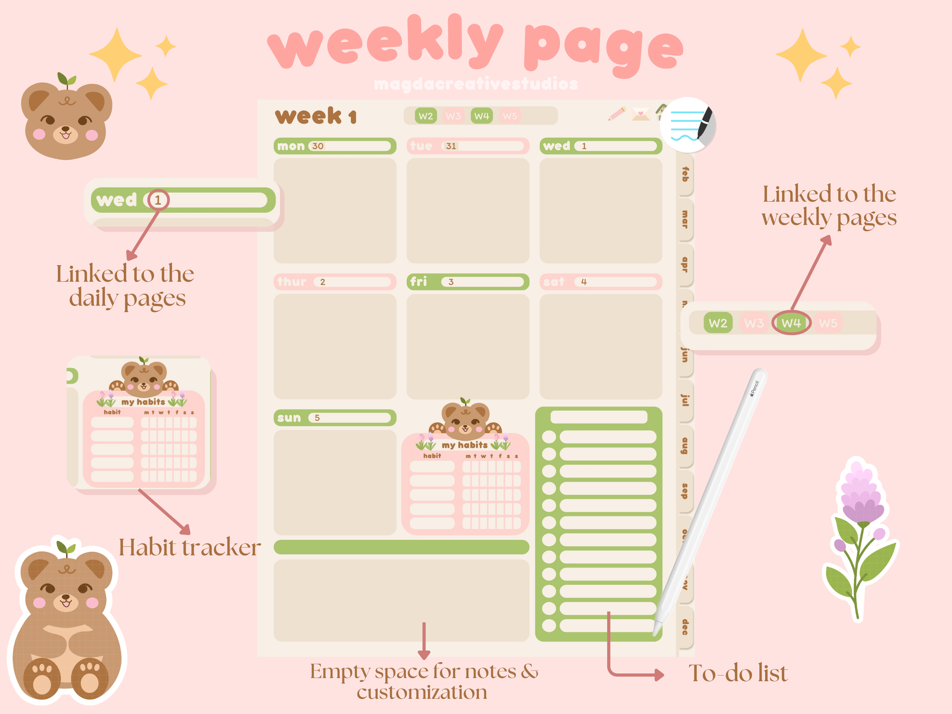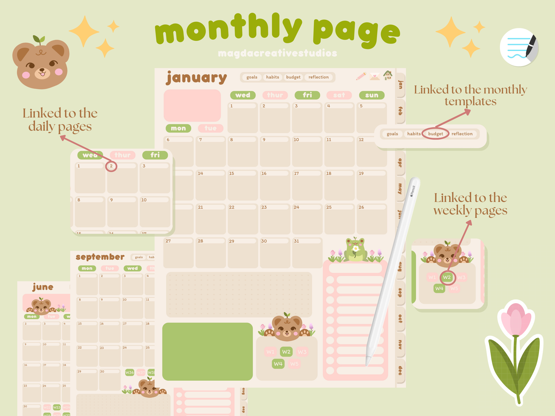 With the Daily Digital Planner, you can easily organise your personal and work life, your finances and notes, all in one place.✨ The planner is dated and fully hyperlinked, with a cute and colourful design to make planning and working more fun and motivating. 😊🌱🐻