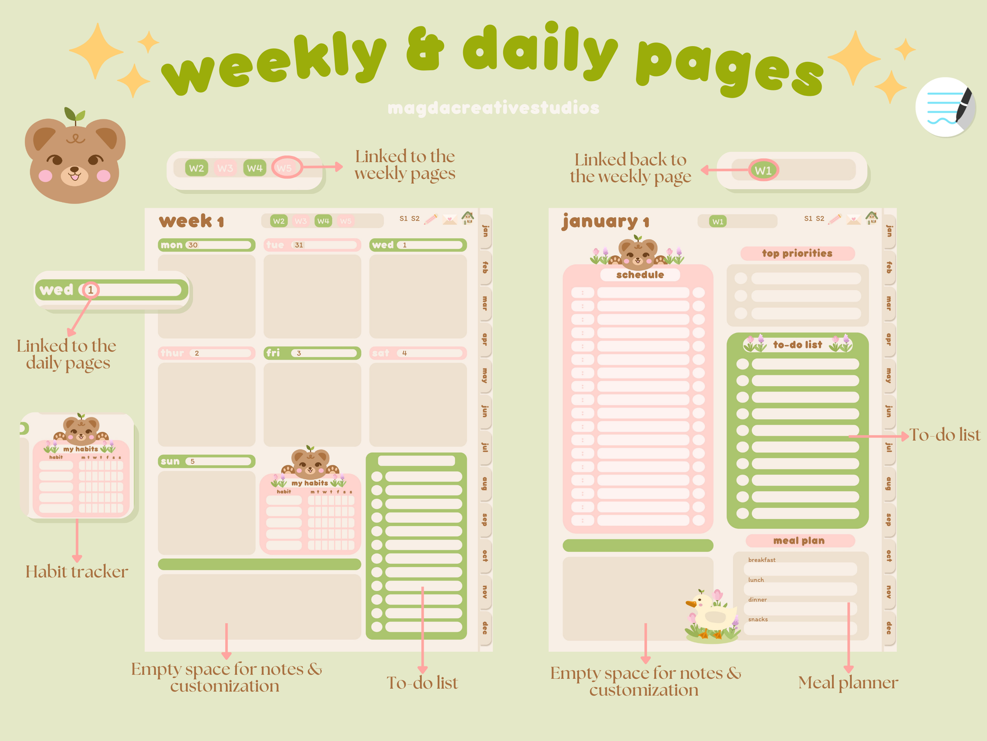 The planner is for 2025 and it's fully hyperlinked and dated so you won't need to duplicate pages.😊 You can quickly and easily navigate through the planner's various sections using the side tabs and the navigation menu in the top right corner. It contains more than 2000 hyperlinks that make it super easy to navigate all its 684 pages. 🧚♀️✨