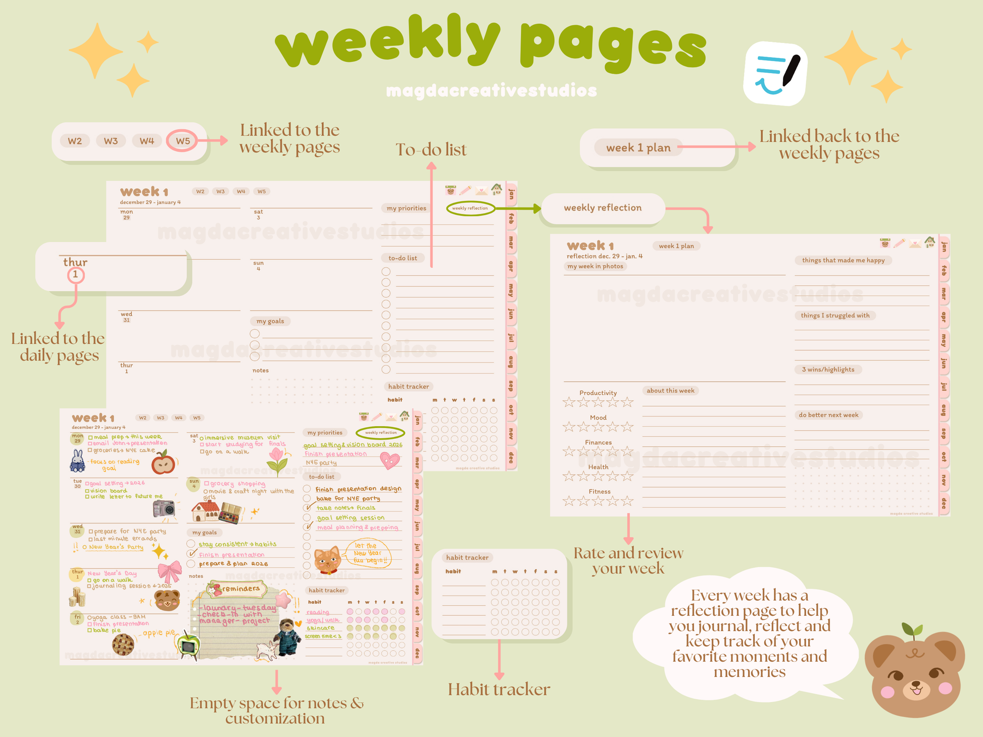 Also, each week of the year has a corresponding weekly reflection page that is linked in the weekly planner.Β π This page makes it super easy to start journaling and keep all your favorite photos, memories, ideas and thoughts in one place. ππ·