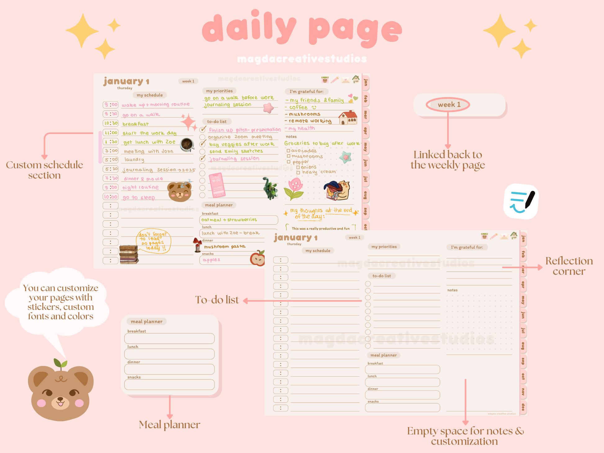 And because we know how important customization is, a set of 48 digital stickers is also included with the planner. π€π» They are 100% hand-drawn by me and they will come in 3 formats : PNG files, GoodNotes file and GoodNotes Elements collection for easy upload.π¨π±