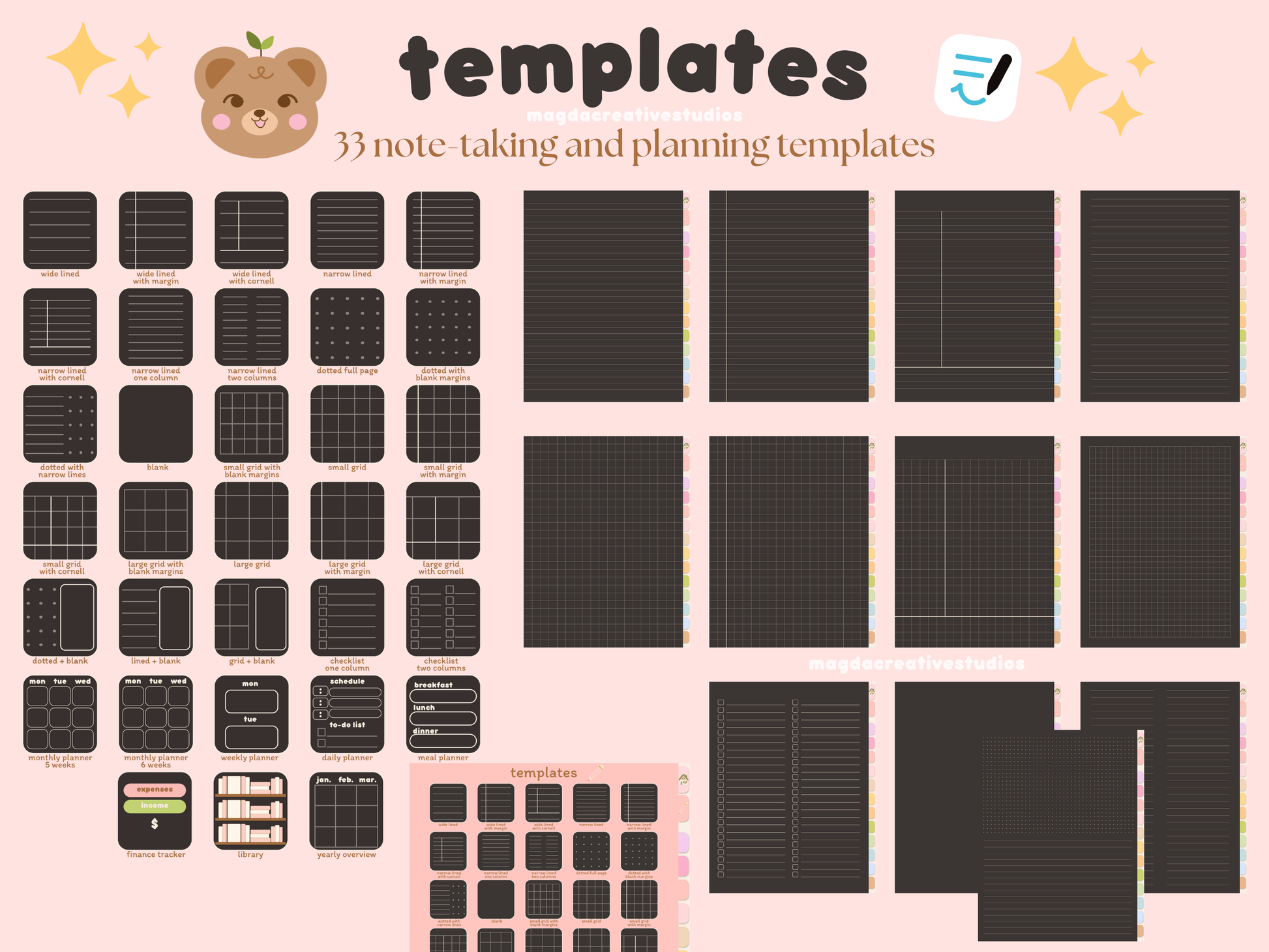 With the GoodNotes digital notebook, you can easily organise your notes, thoughts and goals, all in one place. ✨😊🎧 The dark pages make it easier on the eyes when taking notes or planning at night. 📔 Also, it's perfect for those that prefer the look of notes on dark paper. 🖤📝 It contains 33 note-taking templates and 12 custom sections to help you divide and organise your notebook. 📓✨